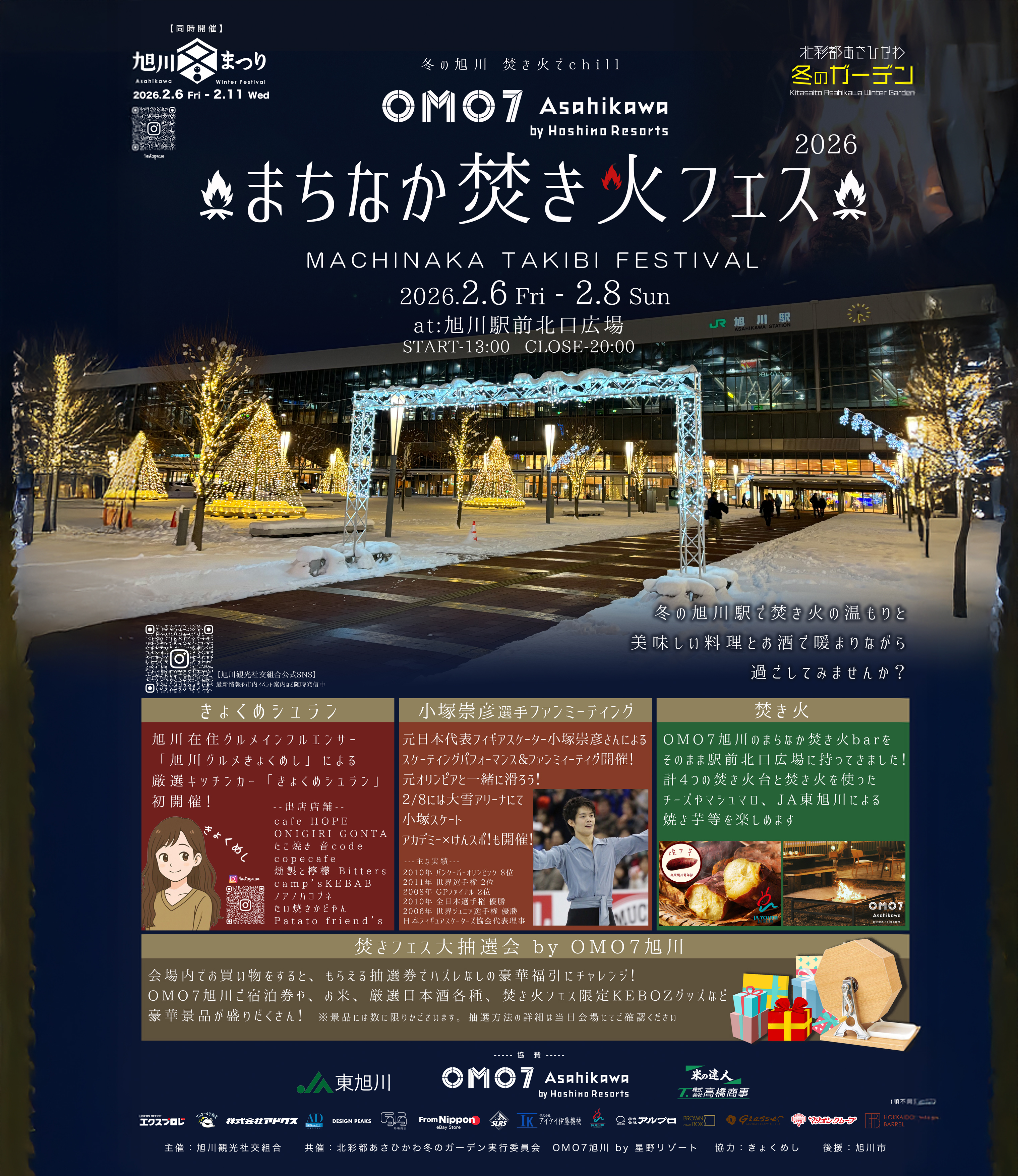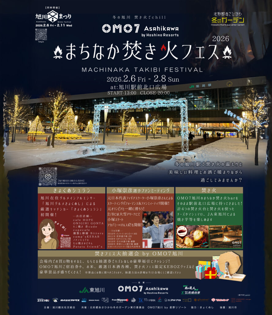 会場では、OMO7旭川のまちなか焚き火barをはじめ、焚き火を囲みながら楽しめるフードやドリンクが登場。チーズやマシュマロ、焼き芋など、冬ならではの味覚が揃います。また、旭川在住グルメインフルエンサー「きょくめシュラン」による厳選キッチンカー企画も初開催されます。